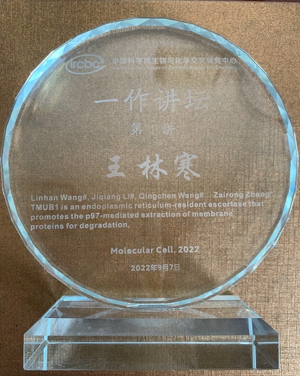 2022年9月7日晚,中国科学院生物与化学交叉研究中心第1期“第一作者讲坛”在交叉中心一楼报告厅举行。本次的主讲人是来自张在荣课题组毕业的王林寒博士,她以“发现促进内质网错误折叠膜蛋白降解的护送因子TMUB1背后的故事”为题,给大家带来了一场精彩的报告。报告由交叉中心贺焯皓研究员主持,张在荣研究员对王林寒同学进行介绍,交叉中心主任袁钧瑛院士出席并为王林寒同学颁发了“第一作者讲坛”纪念奖杯。