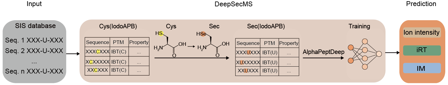 中国科学院上海有机化学研究所生物与化学交叉研究中心张耀阳课题组在前期研究中,开发了Sec特异性的质谱方法(Sec-specific mass spectrometry, SecMS)和非SECIS依赖的硒蛋白数据库(SECIS-independent selenoprotein database, SIS)(PMID: 30174312),首次在小鼠中绘制了组织特异性的硒蛋白图谱,并发现了多个新的硒蛋白,该成果为系统性研究硒蛋白质组提供了重要的理论和数据基础。近日,张耀阳课题组在 Advanced Science上发表了一篇题为“DeepSecMS Advances DIA-Based Selenoproteome Profiling Through Cys-to-Sec Proxy Training”的研究论文。在该项研究中,研究人员基于深度学习和大规模代理数据训练,开发了DeepSecMS方法,深度解析了哺乳动物硒蛋白质组。