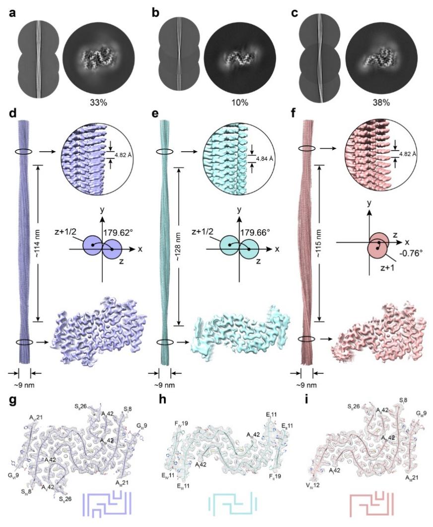 图二、三种新型Aβ42-糖肽共组装纤维的冷冻电镜结构(来源:Nature Communications)