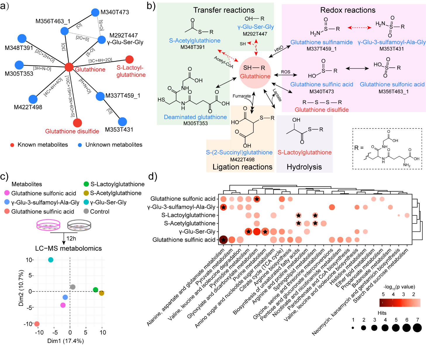 通过深入分析谷胱甘肽相关子网络,该工作首次发现并验证了三个谷胱甘肽相关的未知反应,包括转硫反应生成γ-谷氨酰-丝氨酰-甘氨酸、乙酰化反应生成S-乙酰化谷胱甘肽、以及氧化反应生成磺胺化谷胱甘肽。这些未知代谢反应通过特定稳定同位素示踪实验或体外实验均得到了验证。值得关注的是,谷胱甘肽通过转硫反应直接生成γ-谷氨酰-丝氨酰-甘氨酸,这一新发现表明谷胱甘肽是“硫”的重要供体。尽管目前尚不明确该反应中的巯基转移去向,考虑到硫平衡对机体的重要性,可以推测该转硫反应在生物学上具有重要意义。这些新发现的代谢反应填补了代谢网络图谱中的空白,有助于更深入地理解生命系统,并为研究代谢与生命活动之间的关系提供了新的切入点(图2)。