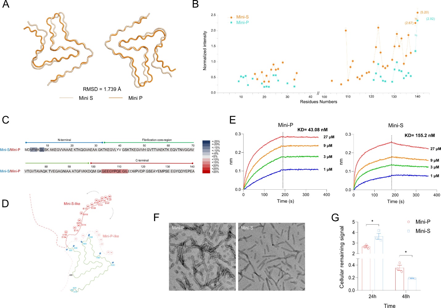通过冷冻电镜(cryo-EM),固态核磁共振(ssNMR)解析发现:Mini-P和Mini-S的纤维核心结构高度相似(图3A),但柔性外壳的动态性差异显著(图3B)。通过氢氘交换质谱(HDX-MS)推测Mini-P的C端柔性外壳与核心结合更紧密(图3C),减少了负电荷暴露(图2D),增强了与神经元表面受体HSPG的亲和力(图3E),同时减少空间位阻,更易抱团抵抗细胞内蛋白酶降解,作为种子存留时间更长(图3F-G)。