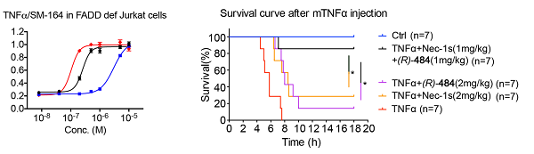 基于Nec-34的结合口袋与已知的RIPK1抑制剂不同,作者提出了联合用药从而协同抑制RIPK1激酶活性的概念。并在细胞水平以及小鼠系统性炎症反应模型中(SIRS)进行了验证,结果显示Nec-34与已知的RIPK1抑制剂Nec-1s在细胞实验和小鼠体内实验中都能够协同抑制RIPK1介导的细胞死亡及TNFα注射引起的小鼠死亡 (图二)。Nec-34的发现为RIPK1小分子抑制剂的开发提供了一个全新的靶向口袋,并且Nec-34联合用药概念的提出也为接下来治疗与RIPK1激酶活性相关的人类疾病提供了新的思路和策略。