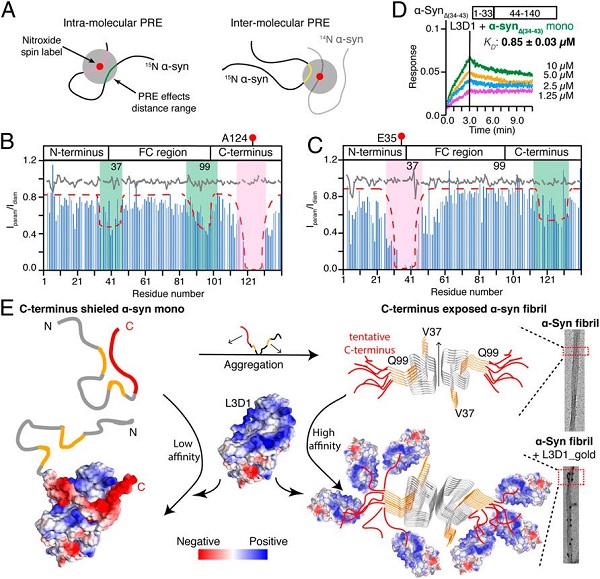 图1:α-syn单体的PRE实验以及L3D1特异性结合α-syn 纤维的分子机制示意图