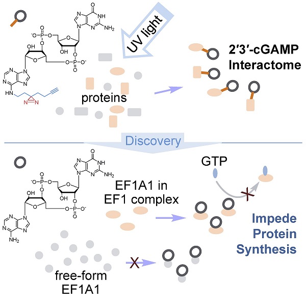 综上,这项工作提供了一种寻找2'3'-cGAMP结合蛋白的方法,并且成功鉴定出结合蛋白EF1A1;另外,首次发现2'3'-cGAMP通过EF1A1抑制蛋白合成的新功能。
