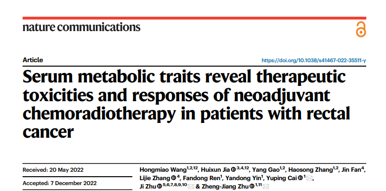 中国科学院上海有机化学研究所生物与化学交叉研究中心朱正江研究员团队与浙江省肿瘤医院朱骥教授团队在Nature Communications杂志在线发表了题为“Serum Metabolic Traits Reveal Therapeutic Toxicities and Responses of Neoadjuvant Chemoradiotherapy in Patients with Rectal Cancer”的研究论文 (Nature Communications, 2022, 13: 7802)。该工作通过对接受新辅助放化疗(Neoadjuvant Chemoradiotherapy, nCRT)的直肠癌患者放化疗过程中多个时间点的血清代谢组学分析,揭示了放化疗治疗过程中的代谢特征变化,并发现了一系列与放化疗毒性和疗效相关的代谢特征和功能代谢物。朱正江课题组博士研究生王洪淼和上海交通大学医学院的贾慧珣博士是论文的共同第一作者,中国科学院上海有机化学研究所生物与化学交叉研究中心为第一单位。