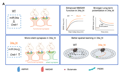 在该研究中,作者首先发现下调miR-34a仅在成熟的小鼠海马体中参与调控NMDARs功能,而幼年小鼠没有此现象。作者进一步通过运用电生理、生化、结构分析等方法检测受体功能、表达及突触结构,发现34a_ht(Heterozygous miR-34a knockout mice)成熟小鼠海马体中有更多的silent synapses。同时作者发现,miR-34a直接靶向调控转录因子——Creb1。成熟34a_ht小鼠海马体中CREB1表达及激活程度地上调与silent synapses的增加有关。由于silent synapses激活后招募AMPARs到突触后膜,转化为功能性突触(functional synapses)是突触可塑性——长时程增强(long-term potentiation, LTP)的经典机制之一。作者紧接着验证了成熟34a_ht小鼠海马中有更强的LTP,以及与之对应的更好的空间学习能力。(Fig 1)