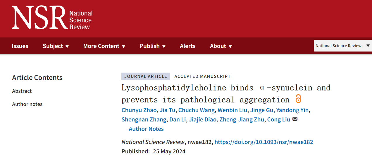 2024年5月25日,中国科学院上海有机化学研究所生物与化学交叉研究中心刘聪课题组,朱正江课题组与美国辛辛那提大学医学院癌症生物学系刁佳杰课题组合作在National Science Review杂志在线发表了题为“Lysophosphatidylcholine binds α-synuclein and prevents its pathological aggregation”的研究成果。该工作首次发现并鉴定了一类特异性识别帕金森病关键致病蛋白α-syn的单体形式的脂类分子,即溶血磷脂酰胆碱(lysophosphatidylcholine,LPC),并揭示了LPC在稳定α-syn天然构象及抑制病理聚集方面的关键作用,建立了帕金森病中脂质代谢紊乱与α-syn病理聚集的内在联系,为治疗帕金森病提供了新思路。