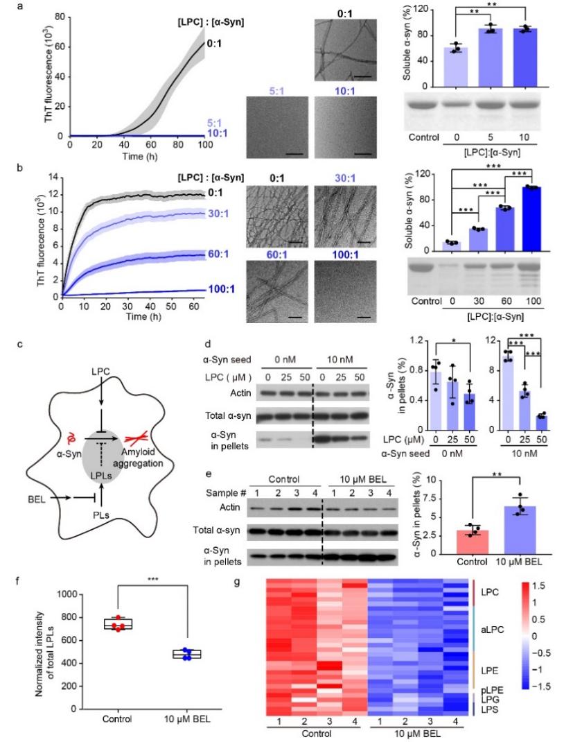 图1. LPC在体外和细胞水平抑制α-syn的病理性聚集