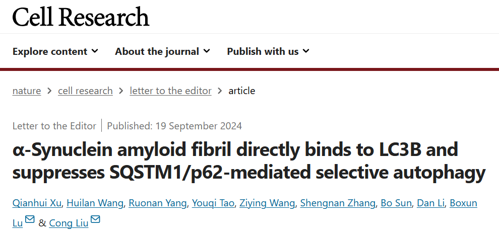 近日,中国科学院上海有机化学研究所生物与化学交叉研究中心刘聪研究员与复旦大学生命科学学院鲁伯埙教授合作在Cell Research上发表题为α-Synuclein amyloid fibril directly binds to LC3B and suppresses SQSTM1/p62-mediated selective autophagy的研究文章。该研究深入探讨了PD病理蛋白α-syn聚集体与自噬关键蛋白LC3B之间的识别互作机制,首次揭示了α-syn病理聚集体与选择性自噬功能障碍之间的直接联系,为理解PD的病理发生机制提供了新的视角。