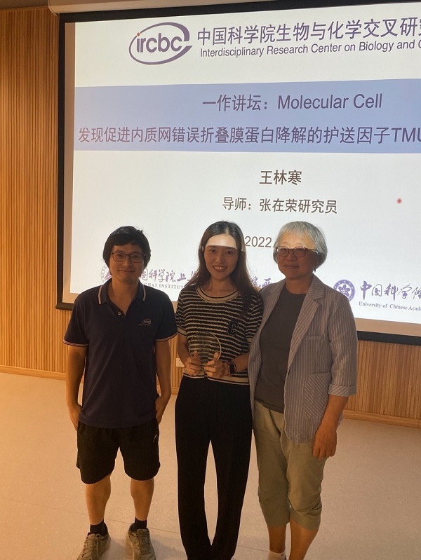 2022年9月7日晚,中国科学院生物与化学交叉研究中心第1期“第一作者讲坛”在交叉中心一楼报告厅举行。本次的主讲人是来自张在荣课题组毕业的王林寒博士,她以“发现促进内质网错误折叠膜蛋白降解的护送因子TMUB1背后的故事”为题,给大家带来了一场精彩的报告。报告由交叉中心贺焯皓研究员主持,张在荣研究员对王林寒同学进行介绍,交叉中心主任袁钧瑛院士出席并为王林寒同学颁发了“第一作者讲坛”纪念奖杯。