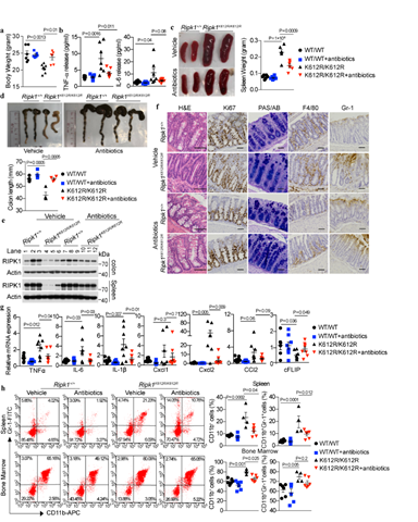 图1. 抗生素抑制RIPK1 K612R突变小鼠的自发结肠炎和脾肿大