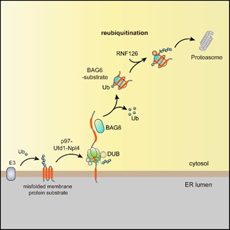 细胞降解错误折叠膜蛋白的这种策略被称为“再泛素化”,其促进了被p97转运或去折叠的蛋白质底物的快速降解,减少了被p97去折叠的肽链在细胞质中停留的时间,从而使底物不至于形成聚积物而对细胞造成损害。并且,该研究揭示RNF126-BAG6的底物范围具有广谱性,显示“再泛素化”可能是一种普遍存在的机制。“再泛素化酶”RNF126在多种癌症细胞中高表达,促进细胞生长,因而可能与癌症细胞清除错误折叠蛋白质的功能紧密相关。