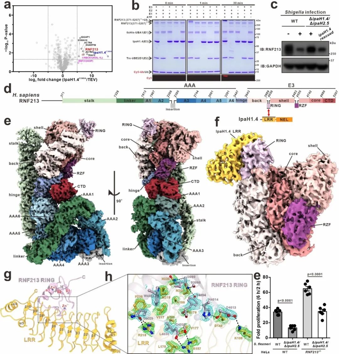 在本项研究中,该研究团队首先通过亲和质谱鉴定,发现免疫关键因子E3泛素连接酶RNF213为福氏志贺氏菌效应蛋白IpaH1.4在人源宿主细胞内的又一个重要的靶标底物蛋白。作为首个被报道的、可介导多糖泛素化修饰的E3泛素连接酶,RNF213可直接泛素化入侵细菌表面的脂多糖(LPS),之后再通过LPS上的泛素化修饰来启动抗入侵细菌的天然免疫反应。随后,通过系统的生物化学、结构生物学和细胞生物学分析,该研究团队首次揭示福氏志贺氏菌的E3效应蛋白IpaH1.4能够通过其LRR结构域与RNF213的RING结构域的特异性相互作用直接靶向人源RNF213,并在细胞内介导RNF213的K48型泛素化修饰及蛋白酶体降解。进一步,该研究团队解析了人源RNF213的冷冻电镜结构以及IpaH1.4 LRR/RNF213 RING复合物的晶体结构,详细阐明了IpaH1.4特异性识别RNF213的分子机制。最后,基于细胞水平的病原菌侵染等功能实验,该研究团队证明了IpaH1.4对宿主RNF213的靶向作用促进了福氏志贺氏菌在感染细胞内的增殖。