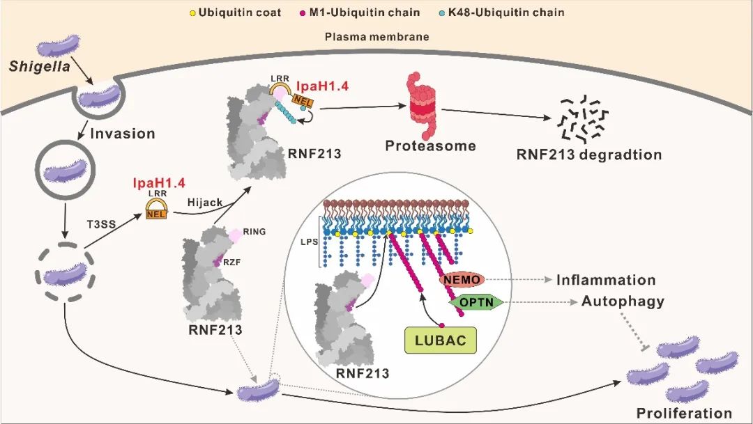 Nat Commun | 张一小团队与合作者发现福氏志贺氏菌的E3效应蛋白IpaH1.4拮抗人源免疫相关蛋白RNF213的新机制