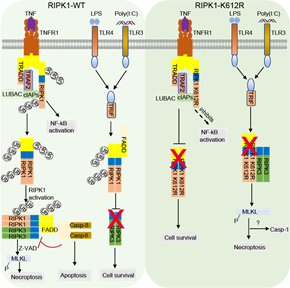 图2.RIPK1 K612R突变调控TNFR1 和TLR3/4信号通路的模式图