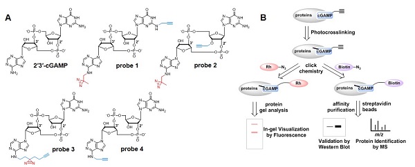 首先研究人员以2'3'-cGAMP为母体合成可光交联、可进行点击化学反应的探针分子。这些探针分子能鉴定出已知靶点STING,并且在与细胞孵育时,也能激起细胞的免疫响应,说明用这些探针寻找潜在靶点有一定的可靠性。探针与Hela细胞裂解液孵育后进行光交联,探针分子就能共价结合到靶蛋白上,接着通过click reaction将biotin接到到探针分子上,之后通过streptavidin beads pull down将与探针分子结合的蛋白进行富集,最后用质谱找到一些2'3'-cGAMP潜在结合蛋白。