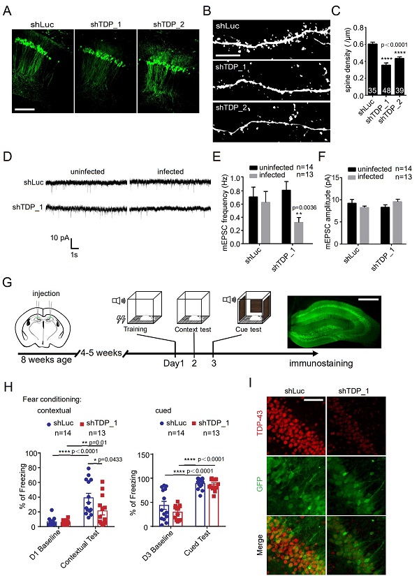 图1 特异性敲低小鼠海马区TDP-43后,神经元兴奋性突触密度降低和海马依赖性认知功能受损。