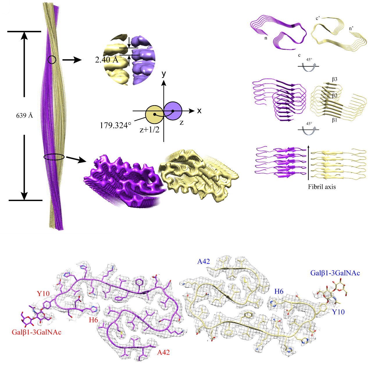 为了进一步阐述糖基化修饰降低Aβ纤维稳定性的分子机理,研究者通过冷冻电镜技术(Cryo-EM),获得了Galβ1-3GalNAc糖型Aβ纤维的3.1 Å近原子级分辨率结构。糖基修饰的Aβ组装形成了一种全新的淀粉样纤维结构,其纤维核心由6-42位氨基酸残基组成,并且在Tyr10残基侧链附近可以观察到修饰糖基的电子密度 (图1)。通过与未修饰的Aβ纤维核心结构进行比较,作者发现Tyr10的糖基化会增大其与相邻氨基酸残基的空间位阻,从而导致整个Aβ纤维核心结构的重排。相较而言,糖基化Aβ纤维的结构具有更小的原纤维间交互界面,且仅由两对盐桥(Asp23和相邻原纤维的Lys28)所维持。这为糖基化修饰降低Aβ纤维稳定性提供了分子层面的解释。