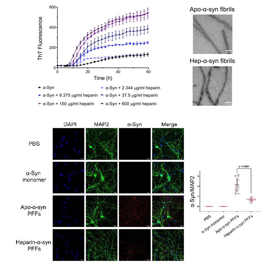 图1. Heparin诱导促进α-syn形成全新纤维构象,并呈现显著降低的神经元毒性。