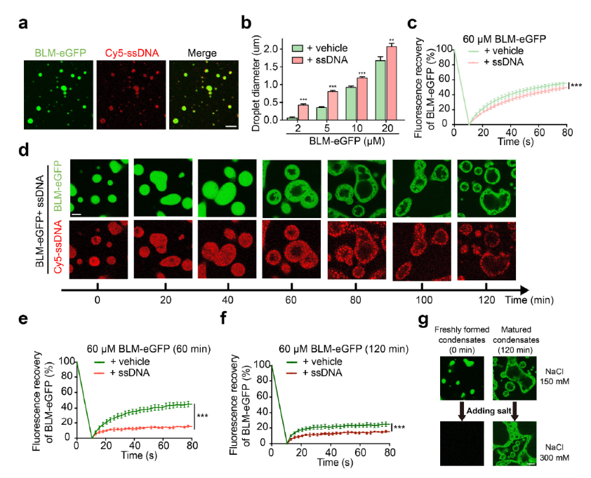 图1. ssDNA促进BLM相分离并形成动态阻滞的BLM/ssDNA共凝聚体。