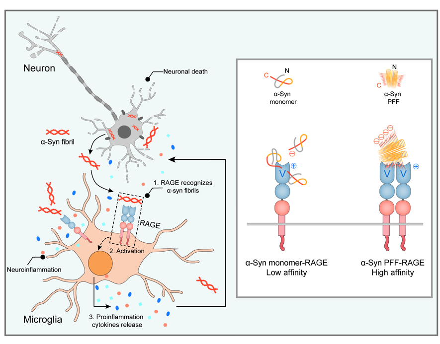 α-突触核蛋白(α-syn)的纤维聚集是帕金森病(Parkinson’s disease, PD)的主要病理标志。随着PD病程的发展,α-syn病理性纤维能够通过神经元表面的膜受体在神经元之间进行传播与扩散。同时,α-Syn纤维聚集能够诱导小胶质细胞的激活与炎症反应。鉴定及表征小胶质细胞膜上识别α-syn病理纤维并激活细胞炎症反应的膜受体,对于阐释α-syn纤维的病理毒性及引起神经炎症反应的分子机制至关重要。RAGE (Receptor for Advanced Glycation Endproducts)作为小胶质细胞的一类重要膜受体,可识别并结合多种不同配体,并在不同疾病中发挥作用。有趣的是,RAGE受体在PD病人的黑质和额叶皮层中的表达量均增加,但其在PD中的作用尚不明确。