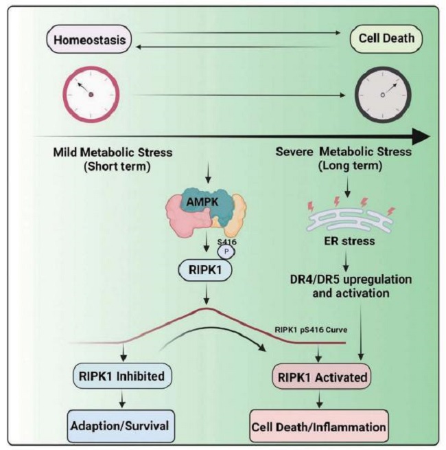 通过Ampk缺失或RIPK1 S415A突变抑制pS415-RIPK1可促进RIPK1的激活。此外,RIPK1基因失活对髓系Ampkα1缺陷小鼠的缺血性损伤有保护作用。该研究表明,AMPK磷酸化RIPK1代表了一个重要的代谢检查点,它决定了细胞对代谢应激的命运反应,并强调了AMPK-RIPK1轴在整合代谢、细胞死亡和炎症中的作用。