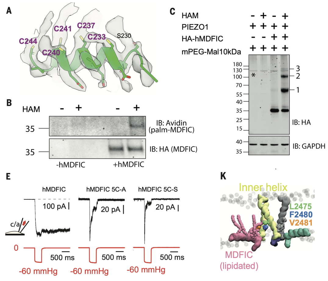 图4. MDFIC的脂质化修饰参与Piezo门控调节
