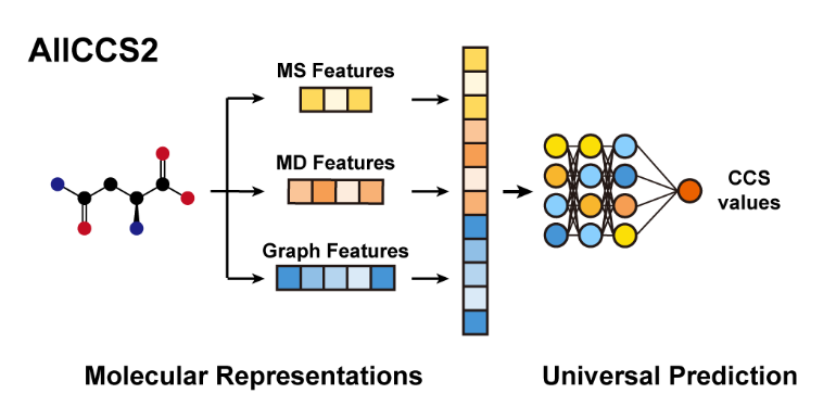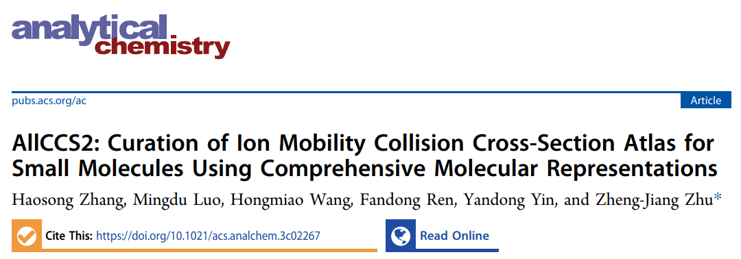 中国科学院上海有机化学研究所生物与化学交叉研究中心朱正江研究员团队在Analytical Chemistry杂志在线发表了题为“AllCCS2: Curation of Ion Mobility Collision Cross-Section Atlas for Small Molecules Using Comprehensive Molecular Representations”的研究论文(Analytical Chemistry, 2023, https://doi.org/10.1021/acs.analchem.3c02267)。该工作在AllCCS(Nature Communications, 2020, https://doi.org/10.1038/s41467-020-18171-8)的基础上,进一步利用多种类型分子表征建立了离子淌度质谱CCS值的神经网络预测模型和数据库。朱正江课题组博士研究生张浩松是论文的第一作者,中国科学院上海有机化学研究所生物与化学交叉研究中心为第一单位。