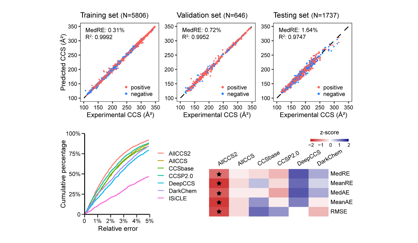 AllCCS2进一步纳入了新获得的实验CCS值作为训练数据,其中包括10384条CCS值记录和7713个统一的CCS值,并且使用了1737个CCS值作为外部数据集用于测试模型效果。AllCCS2利用多种分子表征(包括质谱特征、分子描述符和使用图卷积网络提取的图特征)建立了神经网络预测模型,实现了卓越的预测精度,在训练集、验证集和测试集中分别实现了0.31%、0.72%和1.64%的中值相对误差,在准确性和覆盖率方面超越了现有的CCS预测工具(图2)。