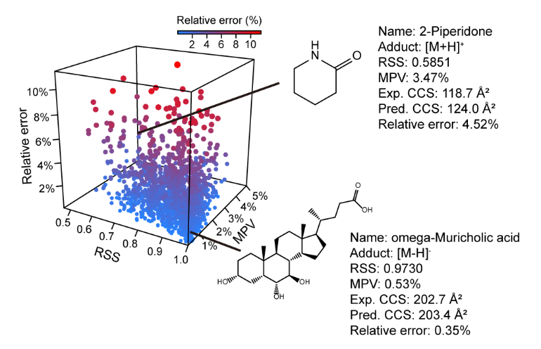 此外,AllCCS2还表现出与不同仪器平台(DTIMS、TWIMS和TIMS)的出色兼容性。工作中还使用代表结构相似性(RSS)和模型预测变异(MPV)综合研究了AllCCS2中来自训练数据和预测模型的预测不确定性。值得注意的是,与训练集结构高度相似且模型预测变化较低的小分子表现出更高的准确性和更低的相对误差,这能够为预测结果的应用提供参考(图3)。