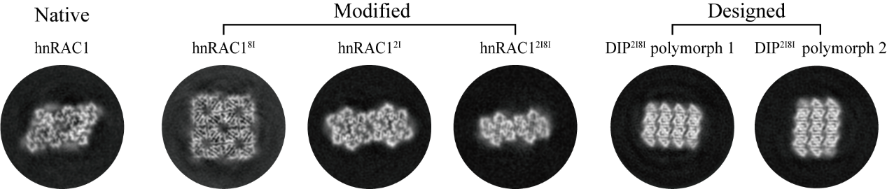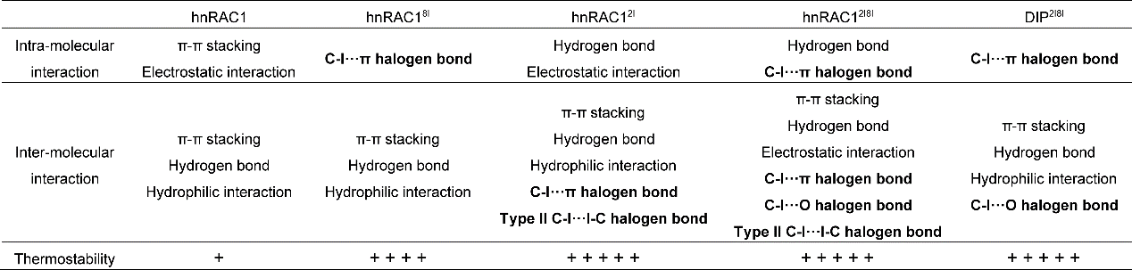 此外,通过在hnRAC1的不同位点引入碘原子修饰,研究人员发现,碘化修饰能诱导hnRAC1形成具有不同原子结构及热稳定性的淀粉样纤维“万花筒”(图1)。进一步的研究发现,这些具有不同结构的多肽淀粉样纤维的自组装是由多肽分子内与分子间形成的各种类型的卤键驱动(表1)。例如,在Phe8的苯环上引入碘原子的hnRAC18I,诱导形成一种分子内C–I···π卤素键,从而将肽链锁定在单一的构象中,组装形成的纤维的截面结构为方形。而在周围区域具有柔性较强Gly的Phe2的苯环上引入碘原子的hnRAC12I或在Phe2的苯环和Phe8的苯环上均引入碘原子的hnRAC12I8I,都会形成多个不同类型的分子间卤素键,诱导产生多种肽链构象。hnRAC12I和hnRAC12I8I组装形成的纤维的界面具有类似于花瓣形的结构(图2)。进一步,研究人员基于对hnRAC1和三种不同碘化多肽纤维原子结构与自组装机制的理解,通过理性设计获得了具有全新结构的碘化肽DIP2I8I淀粉样纤维(图2)。