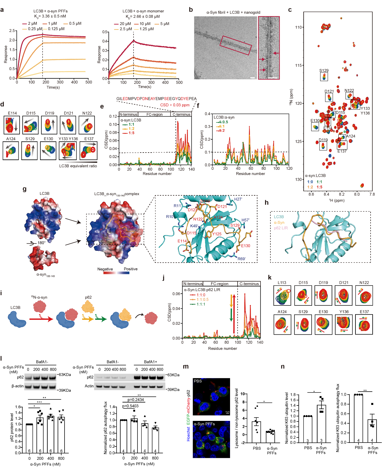 图1. α-Syn淀粉样聚集体通过直接结合LC3B诱导选择性自噬紊乱 (a) 生物膜干涉技术测定LC3B与α-syn结合的动力学曲线 (b) LC3B与α-syn纤维结合的免疫电镜图 (c, d) LC3B滴定15N-α-syn 的二维异核单量子相干谱图及发生化学位移氨基酸的信号放大图 (e.f) LC3B和α-syn核磁共振滴定实验的化学位移距离量化图 (g) AlphaFold-Multimer预测的LC3B与α-syn羧基末端复合物结构 (h) α-Syn与p62在LC3B上结合位点的比较图 (i) LC3B, α-syn, p62竞争性NMR实验示意图 (j) 竞争性NMR实验化学位移距离(CSD)量化图 (k) 竞争性NMR实验代表性氨基酸HSQC信号谱图 (l) α-Syn PFFs处理后p62蛋白水平免疫印迹代表图和自噬流水平量化统计图 (m) EGFP-mCherry-p62双荧光报告系统检测α-Syn PFFs处理后p62自噬流水平 (n) α-Syn PFFs处理后K63泛素化蛋白水平自噬流水平量化统计图