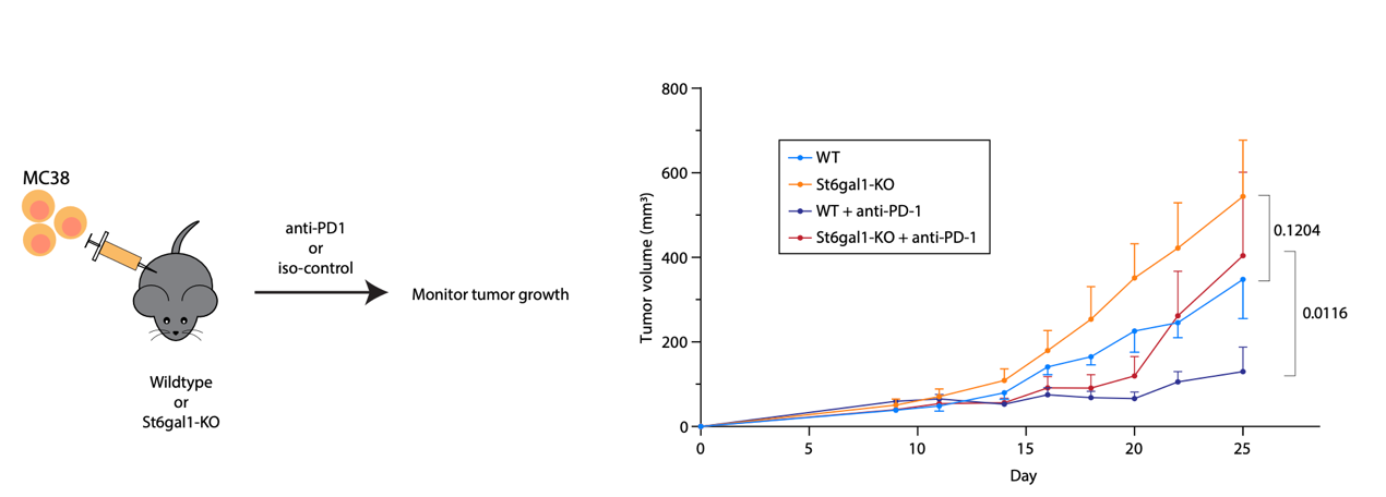 由于T细胞功能减退(如耗竭)与肿瘤等持久性免疫反应紧密相关,研究人员测试了St6gal1-KO T细胞在MC38肿瘤移植模型中控制肿瘤生长的能力。结果表明St6gal1缺失小鼠体内的肿瘤生长更快,且PD-1抗体可部分恢复T细胞功能(图2)。该结果暗示α2,6-连接唾液酸修饰对T细胞功能的调控可能涉及对相关激活/抑制性信号通路平衡的调节,但具体受到调控的受体及通路仍有待明确鉴定。