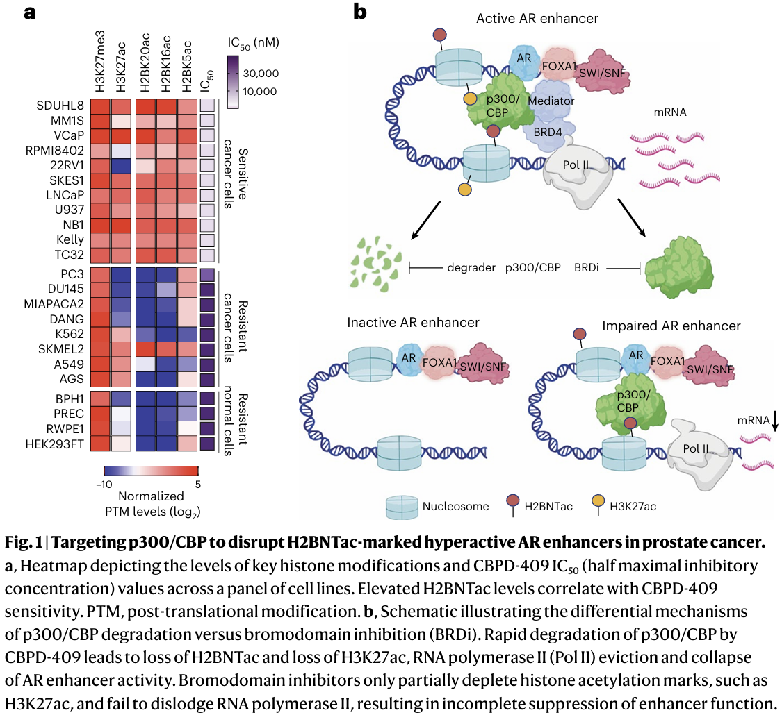 转录因子驱动的异常增强子组(enhanceosome)构成前列腺癌——尤其是去势抵抗性前列腺癌(CRPC)的核心分子特征。雄激素受体(AR)与ERG等致癌转录因子往往通过重塑染色质、激活增强子来驱动癌基因表达。然而,增强子活化依赖表观遗传因子的协同作用,其中乙酰转移酶p300和其同源蛋白CBP(CREB-binding protein)尤为关键。如何在治疗上有效抑制这些“增强子共激活因子”一直是药物研发的难题。
