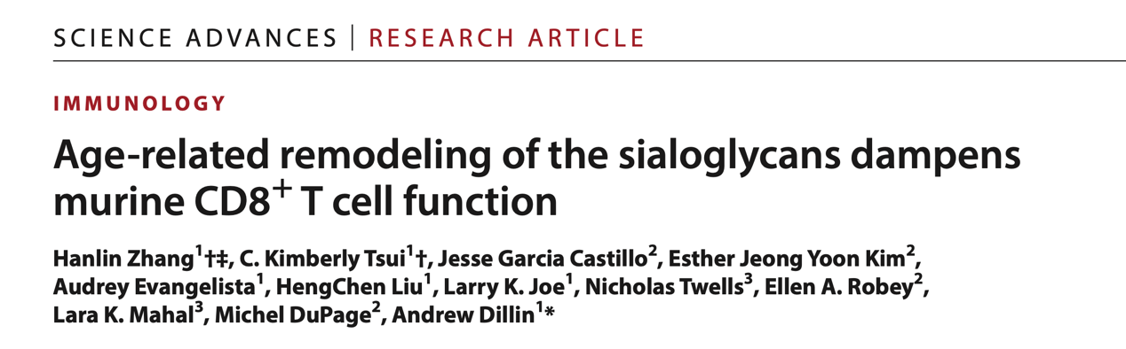 细胞外基质作为细胞微环境的重要组成,其结构与成分变化对细胞功能具有深远影响。其中糖萼作为贴近细胞膜表面的基质组分,由糖蛋白、糖脂等构成,参与细胞信号转导并调控T细胞的发育、稳态维持、活化及耗竭等过程。然而,胞外基质包括糖萼组分在衰老过程中的调控作用尚不明确。2025年9月26日,加州大学伯克利分校和霍华德休斯医学研究所的张汉林(现为中国科学院上海有机化学研究所生物与化学交叉研究中心新聘研究员)和合作者在《Science Advances》上发表研究,以T细胞衰老作为模型,揭示了年龄相关的唾液酸糖基化修饰缺失如何抑制CD8+ T细胞功能,为理解胞外微环境在免疫衰老中的作用提供了新机制。