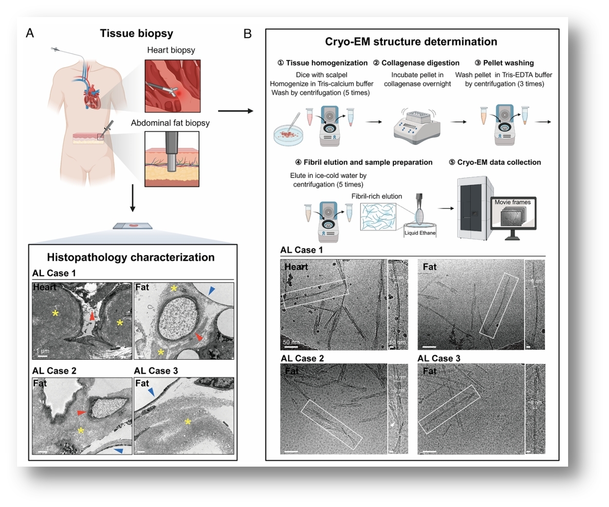 系统性轻链淀粉样变性(AL amyloidosis)是一类由免疫球蛋白轻链(Light chain,LC)异常折叠并形成淀粉样纤维沉积于多器官所致的严重疾病[1],其中心脏受累最为致命[2]。近年来,冷冻电镜技术在淀粉样纤维结构解析方面取得重要进展,但现有高分辨率结构解析所用的纤维样本几乎全部来源于尸检或器官移植后的组织,来自患者临床活检样本的淀粉样纤维结构仍长期缺失[3]。在此背景下,一个关键而悬而未决的问题是:临床常用、易获取的腹部脂肪活检样本中的淀粉样纤维结构,是否能够真实代表心脏等主要受累器官中的病理纤维构象?