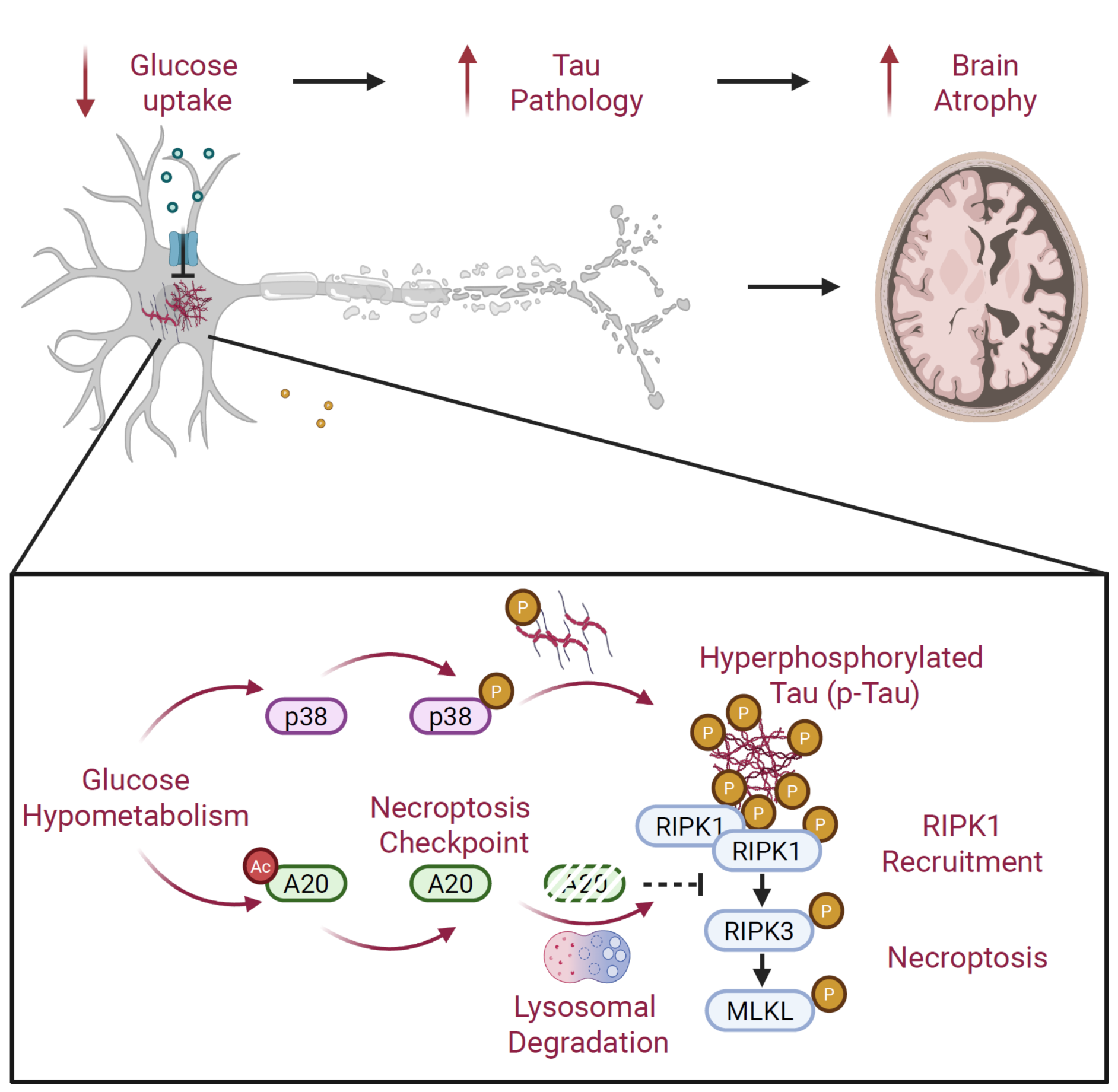 图1. 葡萄糖代谢降低与p-Tau协同驱动神经元程序性坏死的作用机制示意图