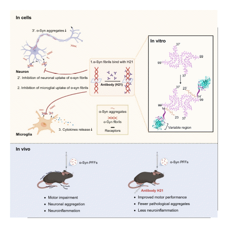 综上,本研究筛选出特异性靶向α-syn病理纤维C端的单克隆抗体H21,并揭示了其与α-syn纤维相互作用的分子机制,以及阻断α-syn纤维病理传播和炎症反应的作用机制。此外,本研究中建立的基于体外筛选和神经元功能验证的筛选策略,未来有望用于靶向其他淀粉样纤维的单克隆抗体筛选。H21展现出的潜在治疗效果,为其向临床应用的推进提供了基础,或为PD的治疗带来新的可能性。